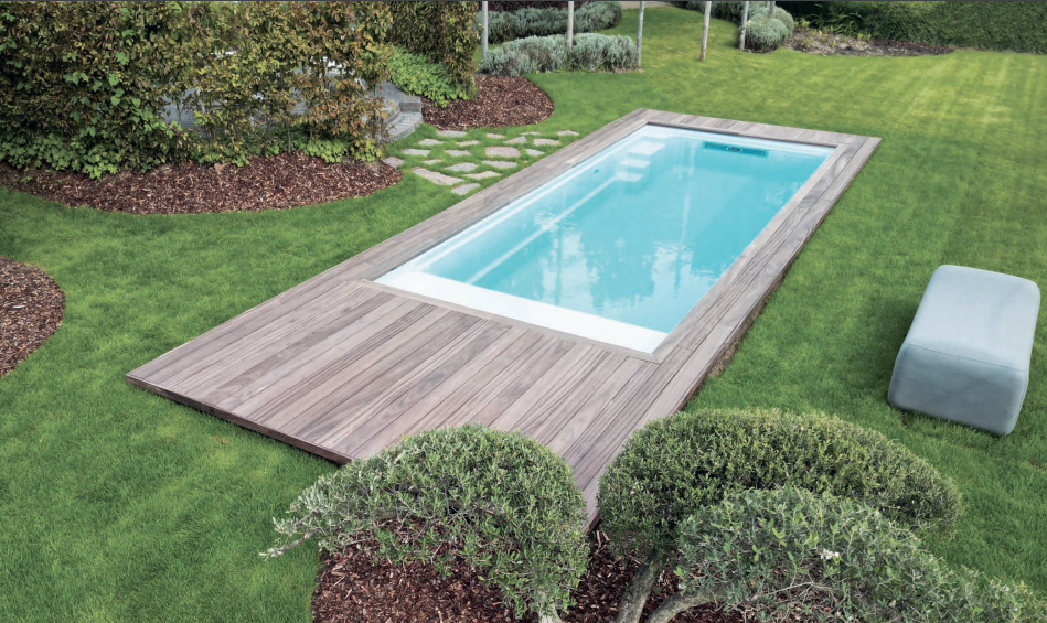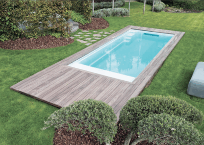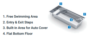 The Encore is the perfect swimming pool for narrow properties and is characterized by its precise straight lines and minimalist design. This flat bottom pool is designed to prioritize functionality and maximize swimming space. Positioned below the water’s surface, the Encore innovatively conceals an automatic pool cover from the pool’s entry steps and features a high waterline for a unique aesthetic appeal.