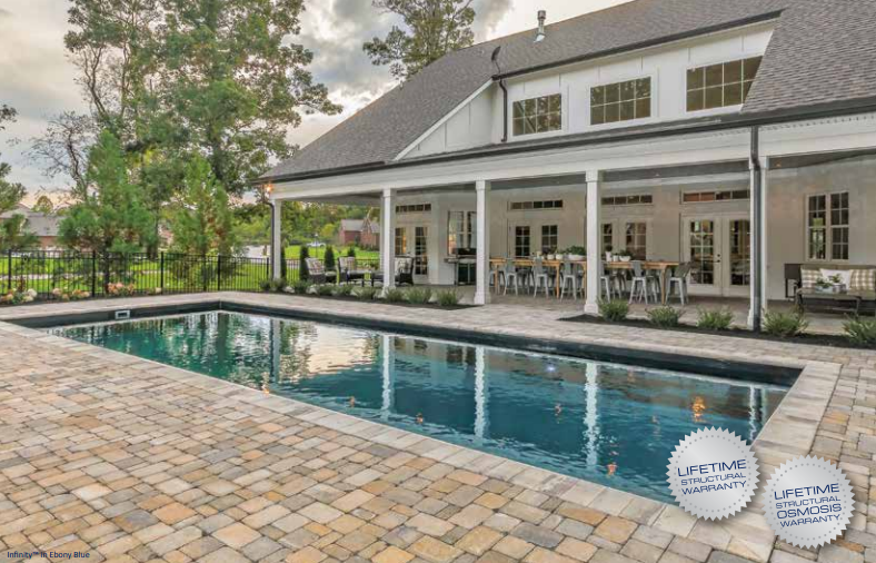 The Infinity is a classic, rectangular design that provides a clean, contemporary look. It allows for end-to-end swimming for exercise and fitness with 40 feet of length. It also features entry steps on both sides of the shallow end with accompanying benches, which also makes it ideal for hosting family gatherings and neighborhood pool parties.