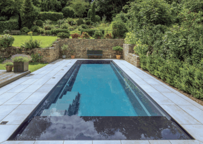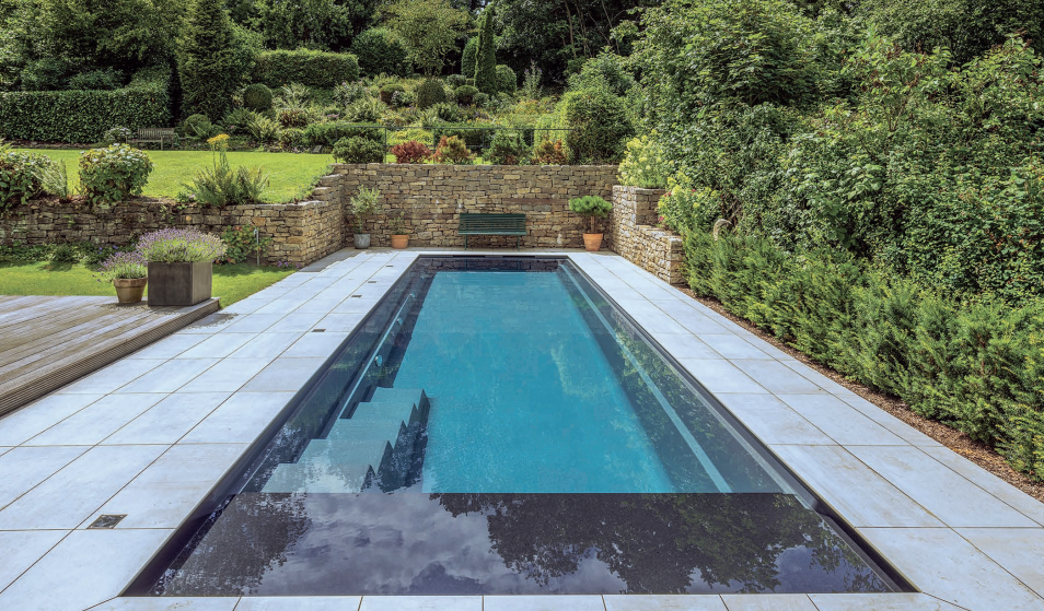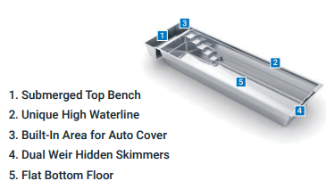 Like the Cube, The Linear has a uniquely high waterline with a minimalist design. With a water depth of 4’ 11” and a width of 10’ 9”, it is ideal for properties where space is at a premium. The optional stone or composite bench mounted below the water surface serves not only as a relaxation and rest area but also as storage space for the electrically operated pool cover which is located underneath. The Linear has a high waterline for a unique aesthetic appeal.