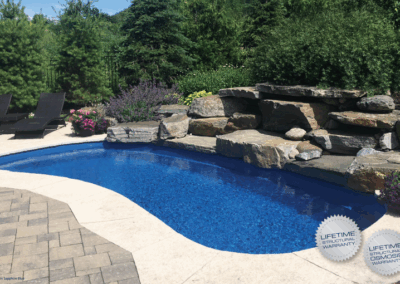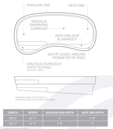 The Tuscany™ maintains generous-sized steps into the pool at the shallow end as well a bench seat swim out toward the deep end. Even though the pool seems quite curved, there is a full-length, unobstructed swimming corridor down the center of the pool, which affords the ability to swim laps.